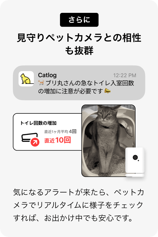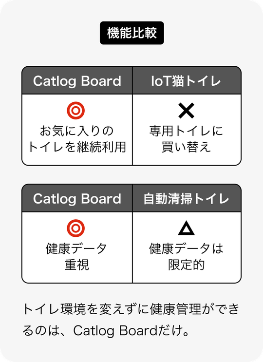 Catlog Boardは今お使いのトイレをそのまま活用できる点が大きな違いです。他社スマートトイレは専用トイレごと購入いただく必要がありますが、Catlog Boardなら猫様が慣れ親しんだ環境を変えずに導入できます。また、おしっこ・うんちの健康データに特化しているため、排泄の異常サイン検知に優れています。自動清掃トイレはお世話の手間を省くことが目的ですが、Catlog Boardは健康管理が目的ですので、役割が異なります。
