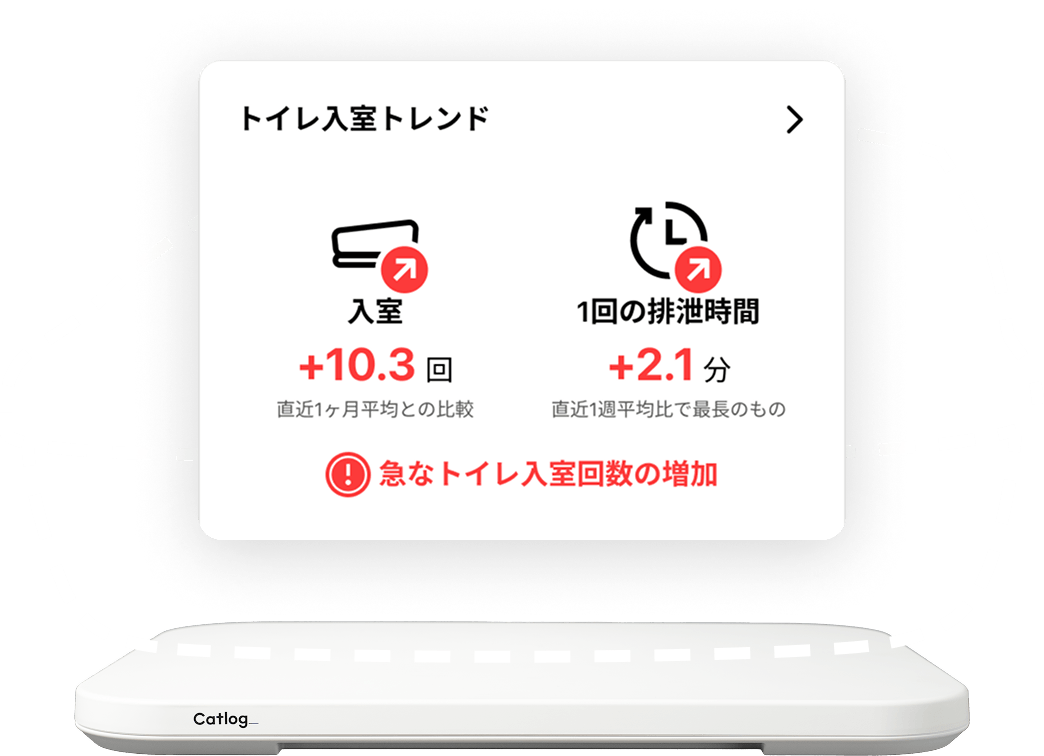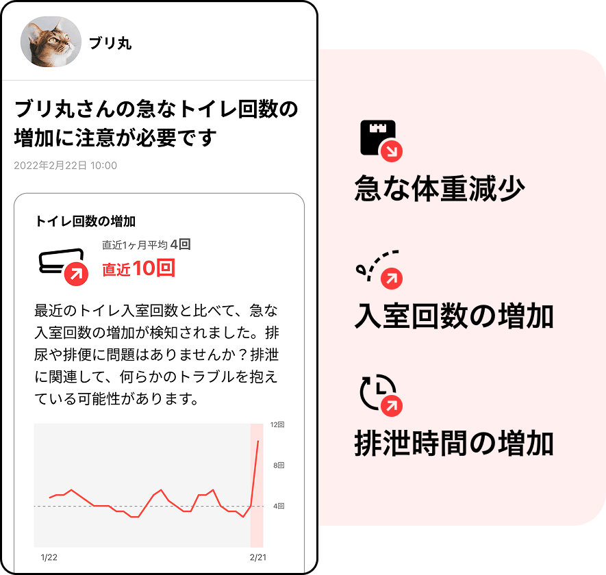 2024年1月頃、お留守番中に何回もトイレに入っており入室回数増加アラートが発生。すぐに動物病院に行くと特発性膀胱炎との診断がされ、点滴と投薬で落ち着きました。