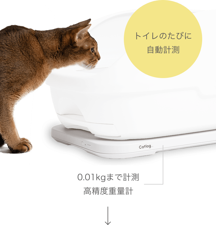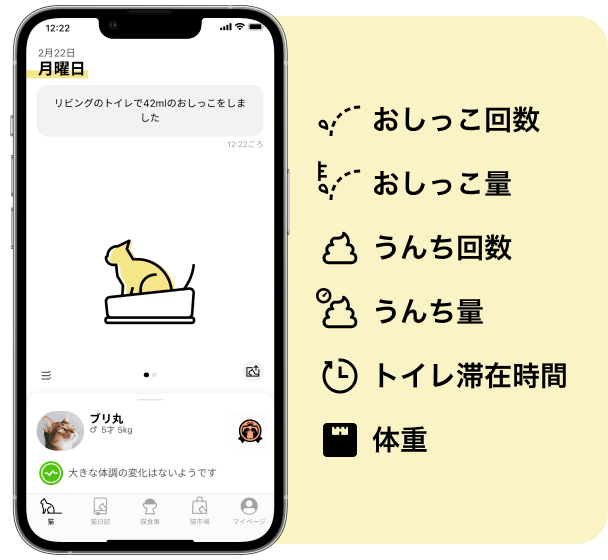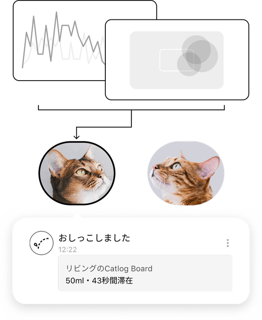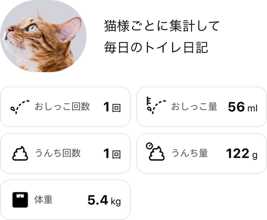 • 体重や排泄時の行動特徴などを元に、AIが"どの猫様の排泄か"を学習。 アプリで体重やトイレ情報を それぞれ分かりやすく表示します。