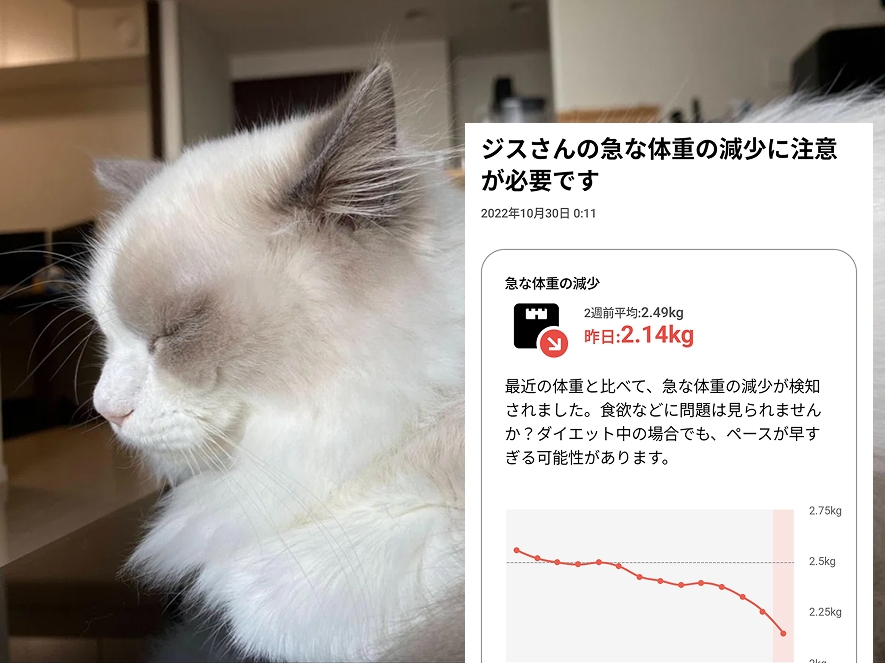 2022年10月頃、成長期の子猫にも関わらず体重が減り始め、連日体重減少アラートが発生。異変を感じて動物病院に通い、最終的にFIP(猫伝染性腹膜炎)と診断されました。