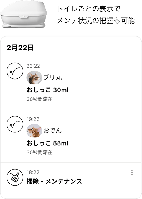• 複数のトイレを、猫様ごとに自動整理して管理できます。