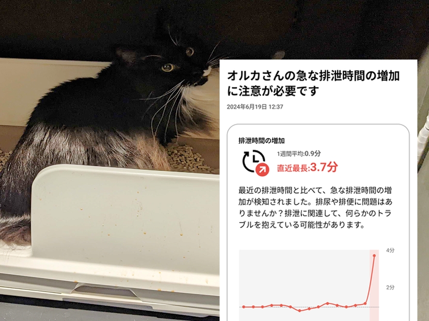 2024年6月頃、突然に排泄時間増加のアラートが発生。トイレ入室回数増加も同時に表示されており、動物病院に行くと結石による尿道閉塞が起きていました。